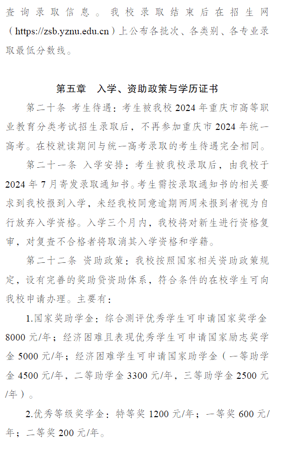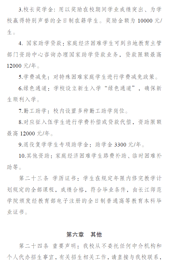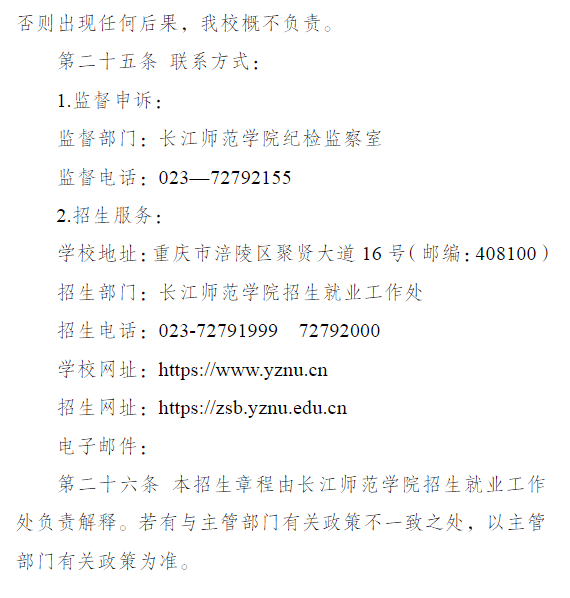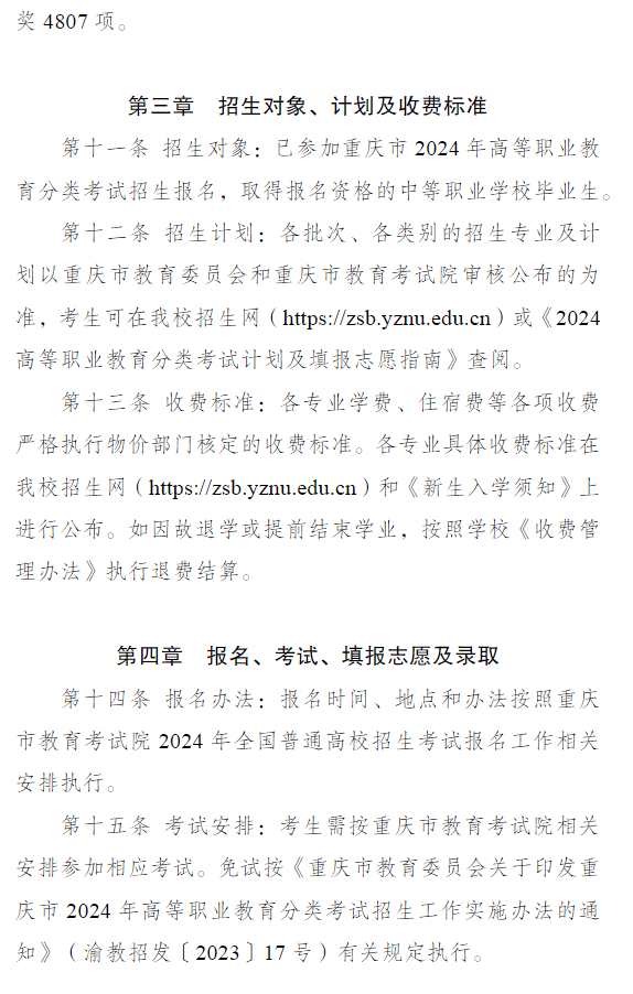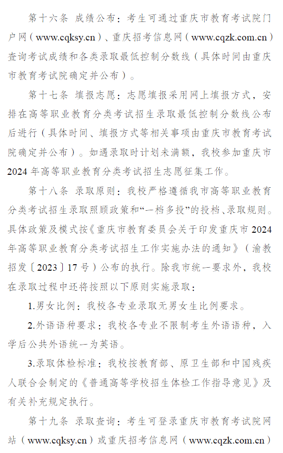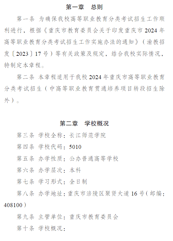 长江师范学院2024年重庆市高等职业教育分类考试招生章程